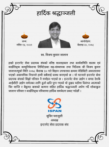 इन्टरनेट सेवा प्रदायक संघ नेपाल (आईस्पान)का वरिष्ठ सल्लाहकार, कार्यसमिति सदस्य तथा वर्ल्डलिंक कम्युनिकेसन्स लिमिटेडका सहसंस्थापक तथा निर्देशक विजय जलानको निधनमा संघले समवेदना प्रकट गरेको छ ।