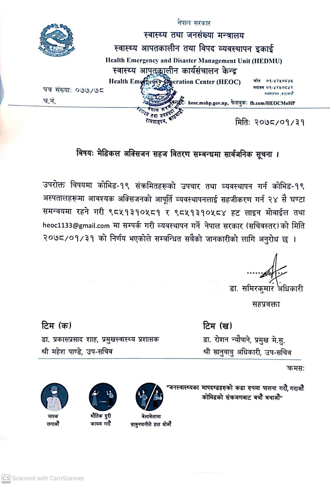 अक्सिजनको आवश्यकता पर्ने अस्पताल र सर्वसाधारणका लागि मन्त्रालयले ९८५१३१०५८१ र ९८५१३१०५८४ नम्बरको व्यवस्था गरिएको मन्त्रालयका सहप्रवक्ता समिरकुमार अधिकारीद्वारा जारी गरिएको सूचनामा उल्लेख गरिएको छ । त्यसैगरि यसको लागि इमेल ठेगाना [email protected] मा पनि सम्पर्क गर्न सकिने बताईएको छ ।
