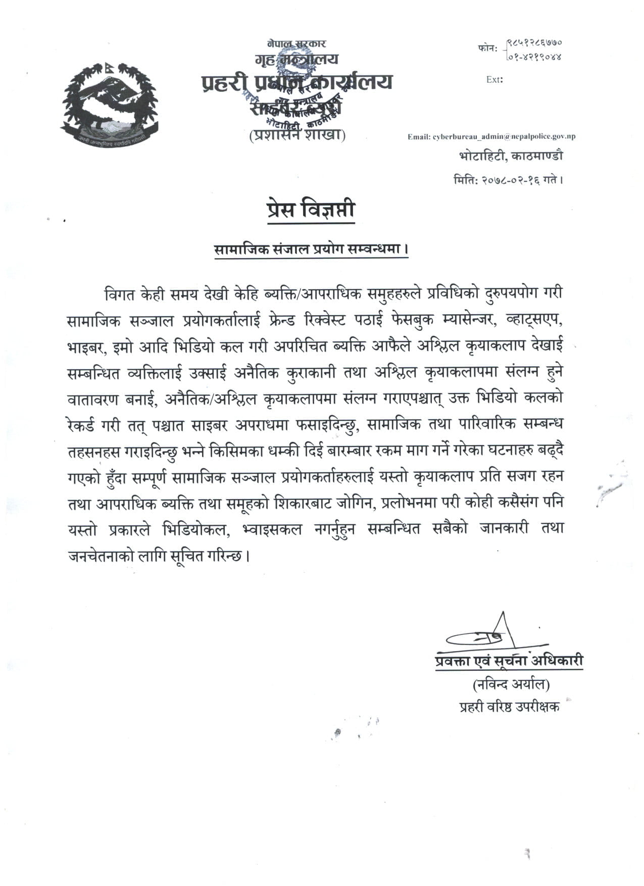 अपराधिक व्यक्ति तथा समूहको शिकारबाट जोगिन र प्रलोभनमा परि कोही कसैसँग भिडियोकल, भ्वाइसकल नगर्न साइबर व्यूरोका प्रवक्ता तथा सूचना अधिकारी प्रहरी वरिष्ठ उपरीक्षक नविन्द अर्यालले आग्रह गरेका हुन् ।