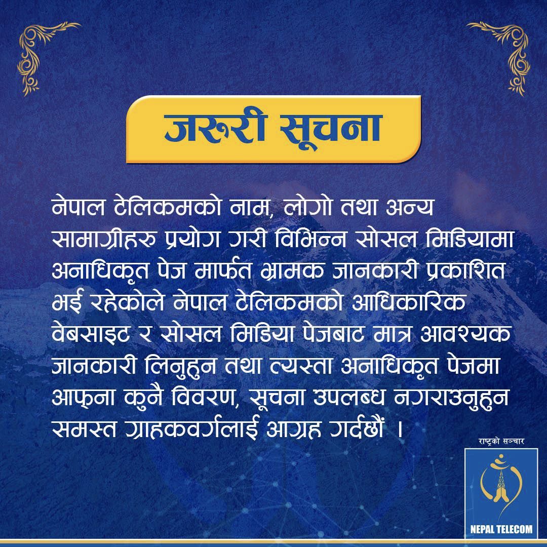 ‘नेपाल टेलिकमको नाम लोगो तथा अन्य सामाग्री प्रयोग गरि विभिन्न सामाजिक सञ्जालहरुमा अनधिकृत पेजमार्फत भ्रामक जानकारी प्रकाशित भईरहेकोले त्यस्ता पेजहरुमा आफ्नो कुनै विवरण उपलब्ध नगराउनुहुन समस्तलाई आग्रह गर्दछौं,’ टेलिकमको फेसबुक पेजमा प्रकाशित सूचनामा भनिएको छ ।