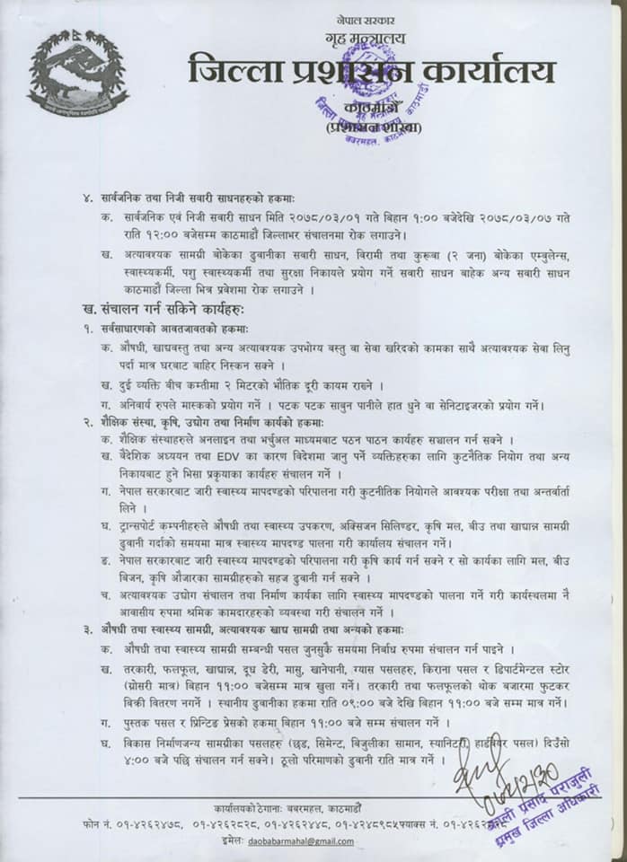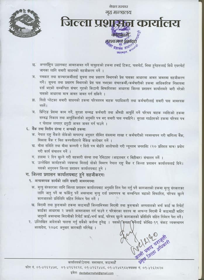 नयाँ आदेशअनुसार प्रशासनले अत्यावश्यक सेवाको अनलाइन तथा टेक अवे सेवा होम डेलिभरी प्रयोजनको लागि उपत्यकाभित्र बेलुका ७ बजेसम्म खुला गर्ने निर्णय गरेको हो ।