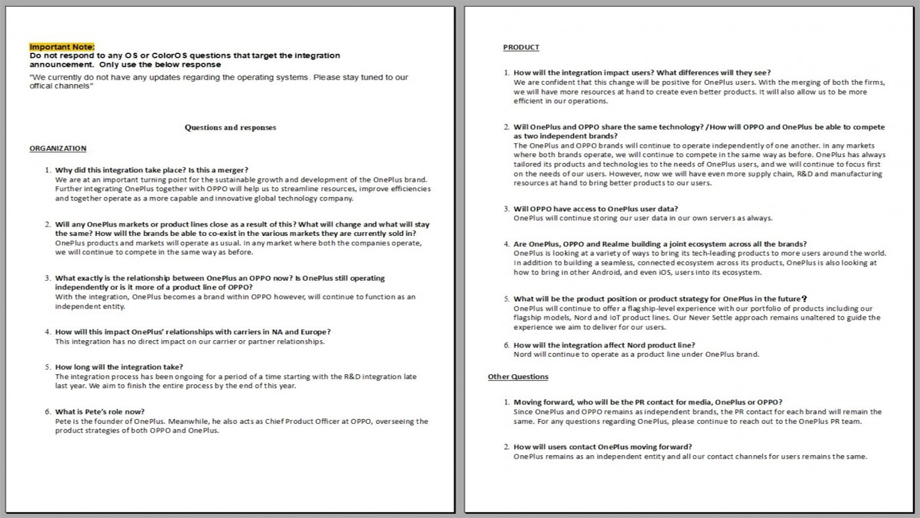 हालै इभान ब्लासले लीक गरेको कम्पनीको एउटा आन्तरिक पत्रमा वनप्लसले आफ्ना कर्मचारीलाई ओएस तथा कलरओएसका बारेमा सोधिका प्रश्नको जवाफ नदिन आदेश दिइएको छ। उक्त पत्रमा जवाफ दिनै परेमा एउटा बनिबानाउ उत्तर पनि समावेश गरिएको छ, जुन यस प्रकार छ: ‘हामीलाई सफ्टवयर अपडेटका बारेमा अहिले कुनै जानकारी छैन। यसका लागि हाम्रो आधिकारिक च्यानल हेर्दै गर्नुहोला।’