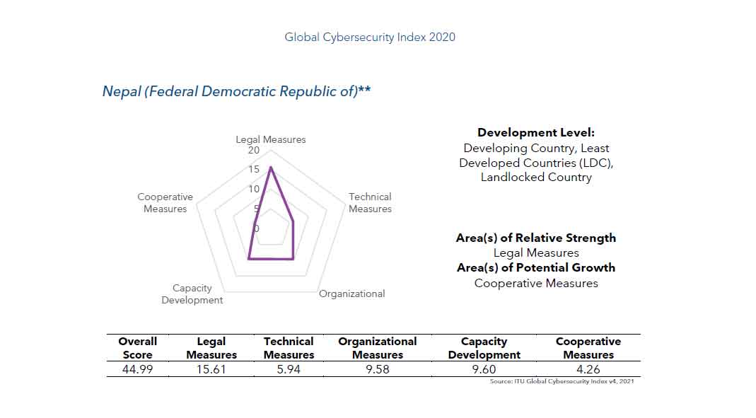 मंगलबार जेनेभामा सार्वजनिक ग्लोबल साइबर सेक्यूरिटी इन्डेक्स रिपोर्ट २०२० अनुसार नेपालले आफूलाई १०९ स्थानबाट उकालेर ९४ स्थानमा पुर्याएको छ । रिपोर्टकाअनुसार नेपालले ग्लोबल साइबर सेक्यूरिटीका विभिन्न क्षेत्रहरुमा कुल ४४.९९ अंक हासिल गरेको छ ।