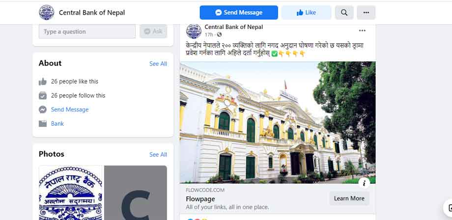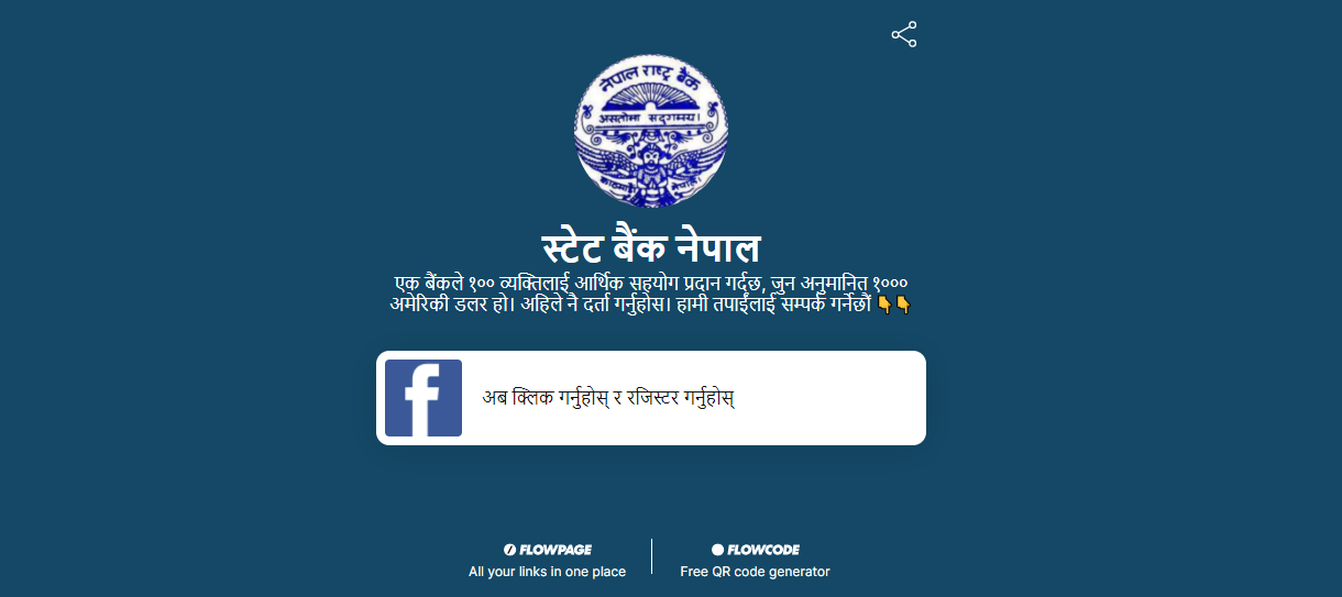 सो नक्कली र अनधिृकत फेसबुक पेजमा गैरकानूनीरुपमा राष्ट्र बैंकको लोगो प्रयोग गरिएको भएपनि त्यसको लिंक भने क्यूआर कोड अनलाइनमा सिर्जना गर्ने कम्पनी फ्लोकोडमा राखिएको छ ।