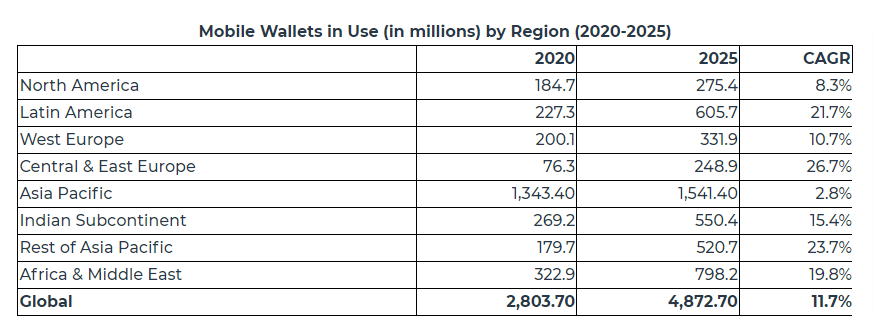 प्रति वर्ष १ अर्ब डलर भन्दा धेरै कारोबार गर्ने मोबाइल वालेटको संख्या २७ प्रतिशतले बढ्नेछ, २०२० मा ५४ वालेटबाट २०२५ सम्ममा ६९ वालेटमा पुग्ने रिपोर्टमा उल्लेख छ। यो बहुमूल्य ग्राहकहरू लिन खोज्ने व्यापारीहरूलाई आकर्षक अवसर प्रदान गर्दछ, जसमध्ये धेरैले मात्र मोबाइल वालेटको प्रयोग गर्छन्।