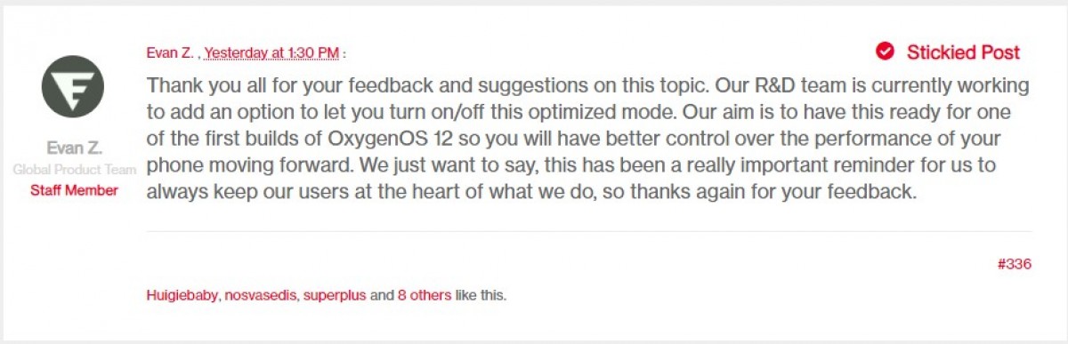 जवाफमा यूजरहरुले आउँदा डिभाइसहरुमा ब्याट्री लाइफ र तापक्रम व्यवस्थापनका बारेमा प्रतिक्रिया दिएको र यसै अनुसार कम्पनीले डिभाइसका पर्फर्मेन्स अप्टिमाइज गरेको वनप्लसले बताएको छ।