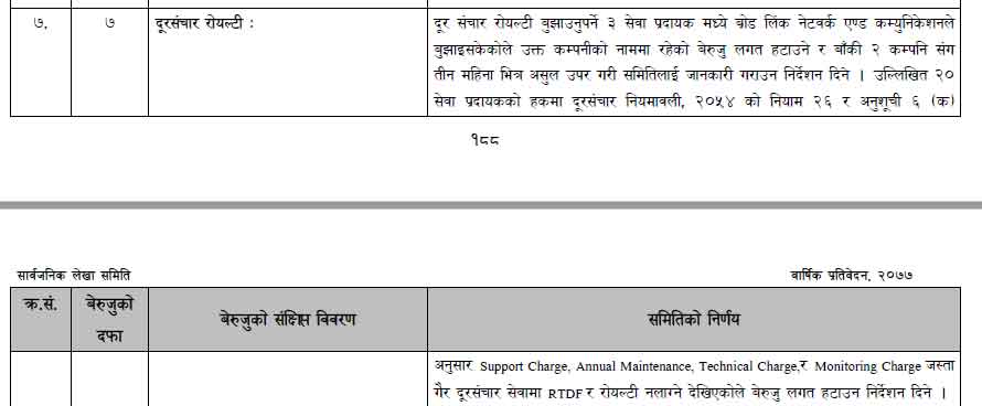 लेखा समितिले हालै प्राधिकरणलाई पत्र पठाउँदै ती कम्पनीहरुको दूरसञ्चार सेवाको मर्मत शुल्कलगायतका विषयहरु गैर दूरसञ्चार सेवा शुल्क भएको ब्याख्या गर्दै ती सबै रकम बेरुजुबाट हटाउन निर्देशन दिएको हो।