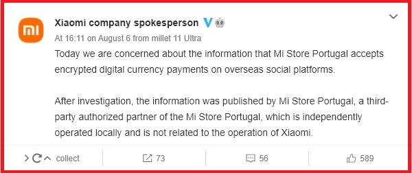 यसै विरोधाभासलाई चिर्न शाओमीका प्रवक्ताले केही दिन अघि वेबोमा एउटा विज्ञप्ति पोस्ट गर्दै पोर्चुगलमा रहेको क्रिप्टोकरेन्सीमार्फत भुक्तानी लिने भनिएको एमआई स्टोर कम्पनीको शाखा नभइ कुनै तेस्रो पक्षले खोलेको स्टोर भएको प्रस्टिकरण दिनुपरेको थियो।