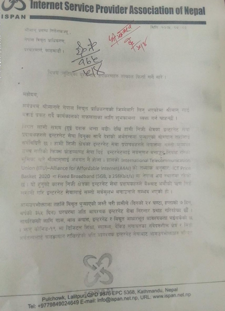 आईस्पानले गत भाद्र २ गते नेपाल विद्युत प्राधिकरणको बागमती प्रदेशअन्तरगत भरतपुर वितरण केन्द्रले इन्टरनेट सेवा प्रदायकहरुको तार काटिदिएको भन्दै विज्ञप्ति निकालेको थियो।