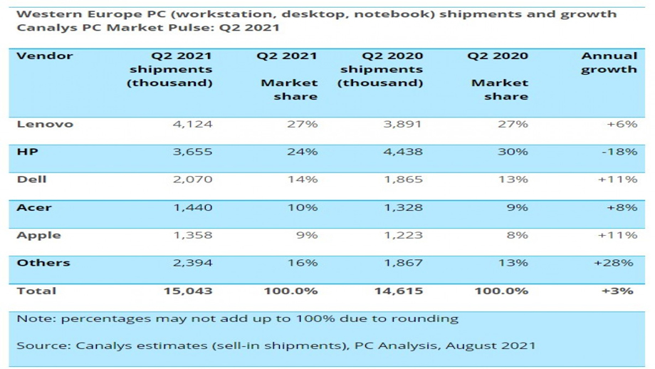 क्यानालिसिसको रिपोर्ट अनुसार पश्चिम यूरोपका बजारमा डेस्कटप, नोटबुक तथा वर्क स्टेशनको अत्यधिक मागका बावजूद बिक्री भने घटेको देखिएको छ।