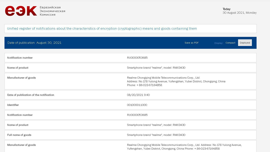 चिनियाँ कम्पनी रियलमीको नार्जो ५०ए स्मार्टफोनले ईईसी सर्टिफिकेट प्राप्त गरेको छ। ईईसीको मतलब यूरेसियन इकोनोमिक कमिसन हो।