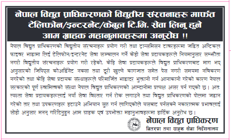 ‘अतः त्यस्ता सेवा प्रदायकहरूलाई नयाँ सेवा विस्तार गर्न रोक लगाउने तथा विद्युत प्राधिकरणको पोलमा जडान गरेको तार तथा उपकरणहरू हटाउने अभियान सुरु गर्न लागिएकोले यसबाट पर्नसक्ने नकारात्मक प्रभावलाई सोही अनुसार मनन् गरिदिनुहुन आम ग्राहक एवं उपभोक्ता महानुभावहरूमा हार्दिक अनुरोध छ,’ सूचनामा भनिएको छ ।