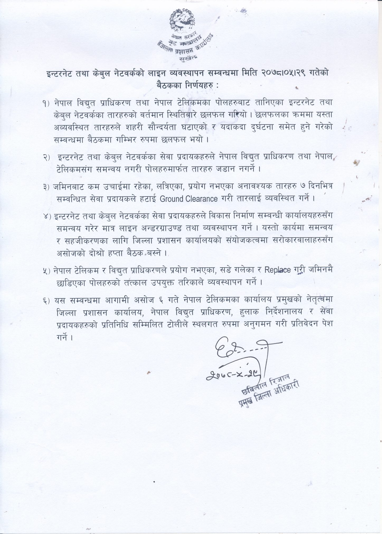 प्रमुख जिल्ला अधिकारी छविलाल रिजालको अध्यक्षतामा इन्टरनेट तथा केबुल नेटवर्कका तार व्यवस्थापन गर्ने सम्बन्धमा बसेको बैठकले नेपाल टेलिकम र नेपाल विद्युत् प्राधिकरणले प्रयोग नभएका, सडेगलेका एवं स्थानान्तरण गरी सडकमै छाडिएका पोलहरु तत्काल व्यवस्थापन गर्न निर्देशन दिएको छ।