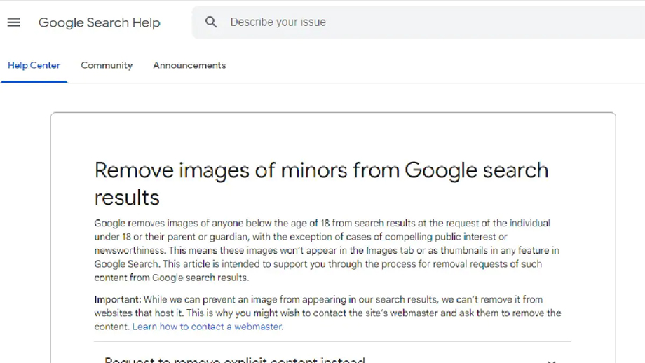 यदि तपाईंको बच्चाको त्यस्तो कुनै फोटो गुगल सर्च परिणाममा उपलब्ध छ, जुन तपाईं हटाउन चाहनुहुन्छ भने, तपाईंले गुगललाई अनुरोध गरेर त्यसो गर्न सक्नुहुन्छ।