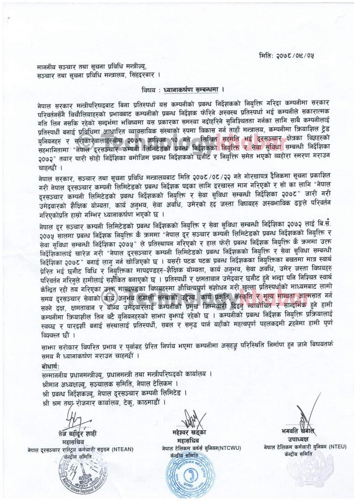 नेपाल दूरसञ्चार कम्पनी लिमिटेड (नेपाल टेलिकम) को नयाँ प्रबन्ध निर्देशक(एमडी) पदका लागि मागिएको दरखास्तका लागि तयार पारिएको नयाँ निर्देशिकामा गम्भीर आपत्ति प्रकट गरेका छन्।