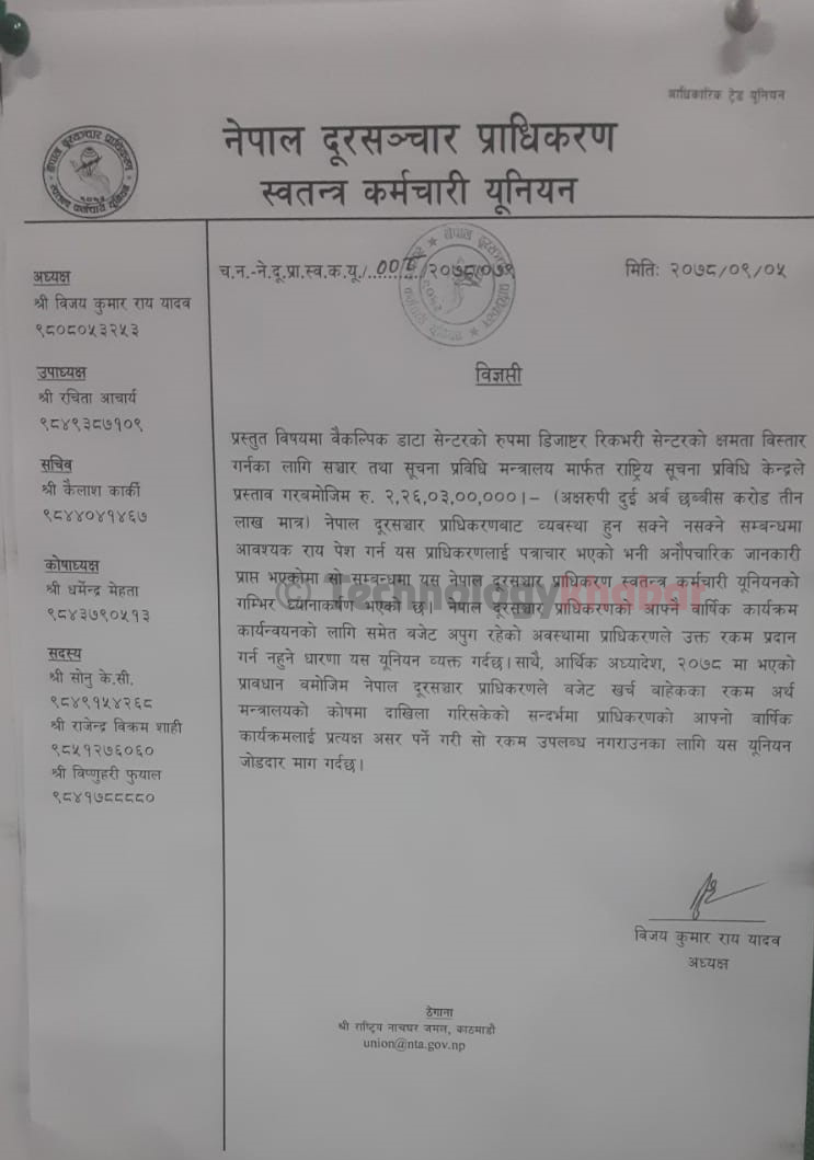 प्राधिकरणको स्वतन्त्र कर्मचारी युनियनले सोमबार प्रेस विज्ञप्ती जारी गर्दै केन्द्रले डिजास्टर रिकभरी सेन्टरको क्षमता बिस्तारको लागि सञ्चार तथा सूचना प्रविधि मन्त्रालयमार्फत अनौपचारिकरुपमा २ अर्ब २६ करोड ३ लाख रुपैयाँ माग गरेको भन्दै सो बारेमा गम्भिर ध्यानाकर्षण भएको जनाएको हो।