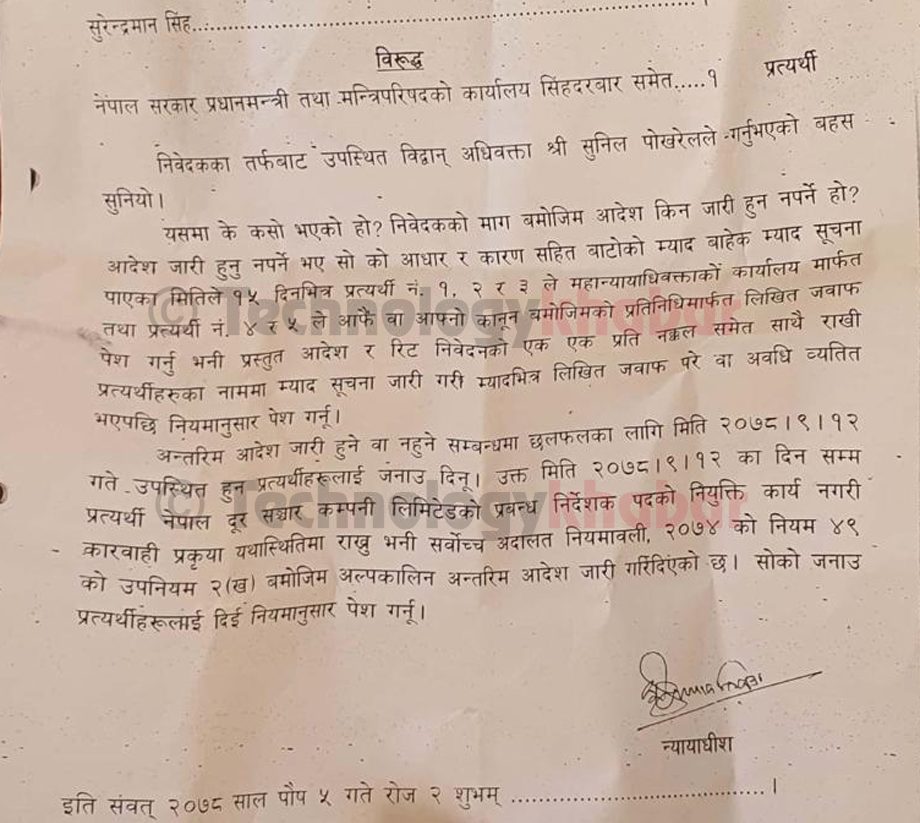 नेपाल टेलिकमको प्रबन्ध निर्देशक पदको प्रकृयामा अन्तरिम आदेश माग गरेर परेको मुद्दामा सर्वोच्च अदालतले दिएको कारण देखाउ आदेशको पत्र सञ्चार तथा सूचना प्रविधि मन्त्रालयमा दर्ता भएको छ।