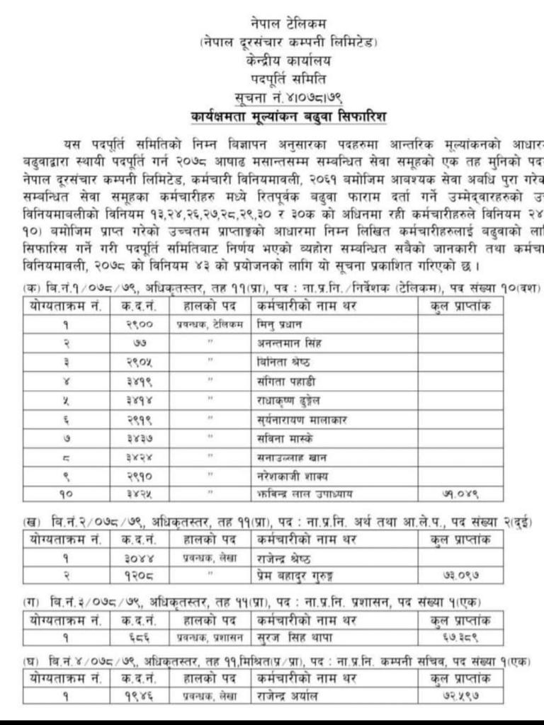 पुस ७ गतेसम्म दरखास्त दिने समयअवधि रहेको प्रबन्ध निर्देशक पदमा दरखास्त हालेका नेपाल टेलिकमका वर्तमान कर्मचारीहरु संगिता पहाडी र सुरज सिंह थापासहित अन्य १२ जना कर्मचारीहरु टेलिकमको ११ औं तहमा बढुवा भएका हुन्।