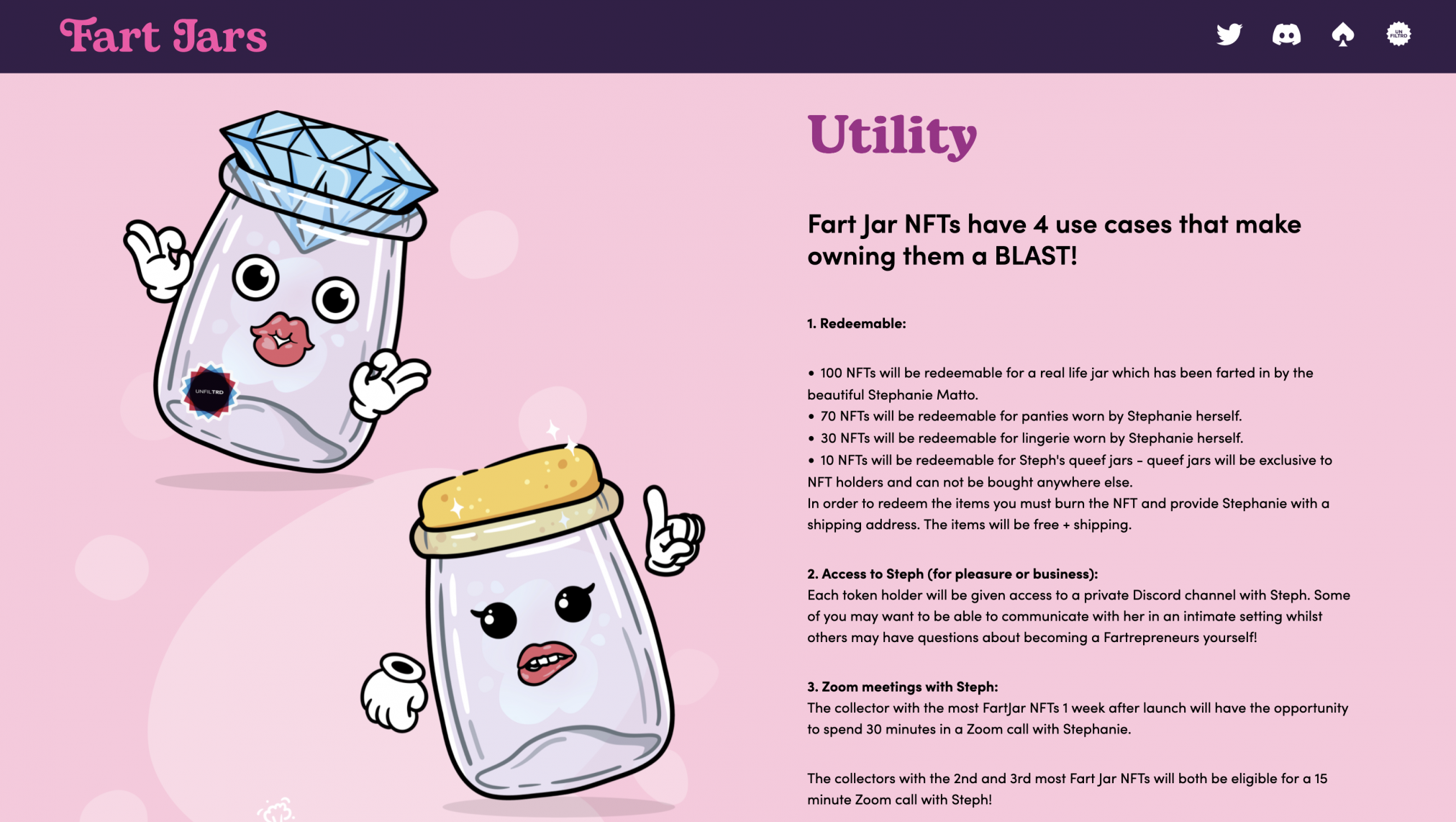 उनले फार्ट जार एनएफटी बिक्रीबाट वास्तविक संसारको फार्ट जारमा घटाउने वेबसाइटमा उल्लेख गरेकि छिन्।
