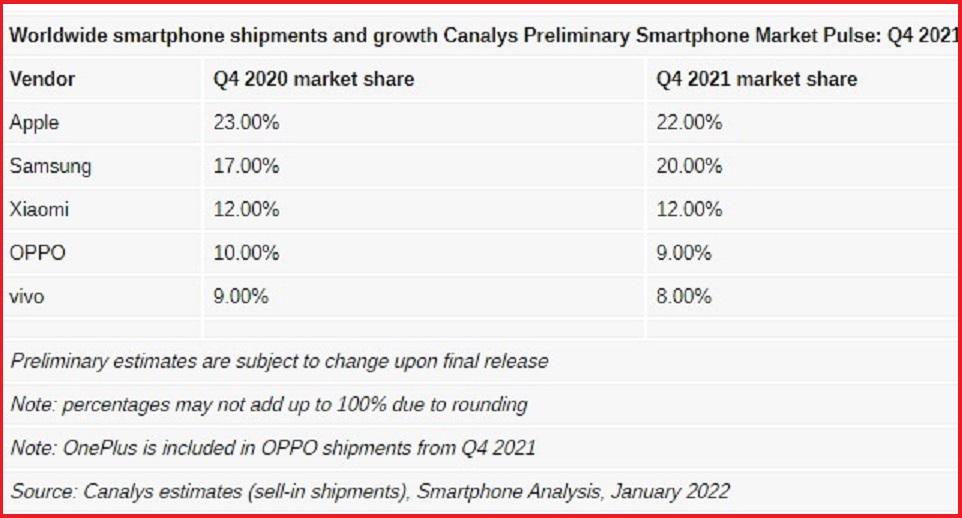 सबैभन्दा बढी स्मार्टफोन बिक्री गरेर एप्पल २०२१ को चाैथो त्रैमासमा स्मार्टफोन बजारको शीर्ष स्थानमा उक्लिएको छ।