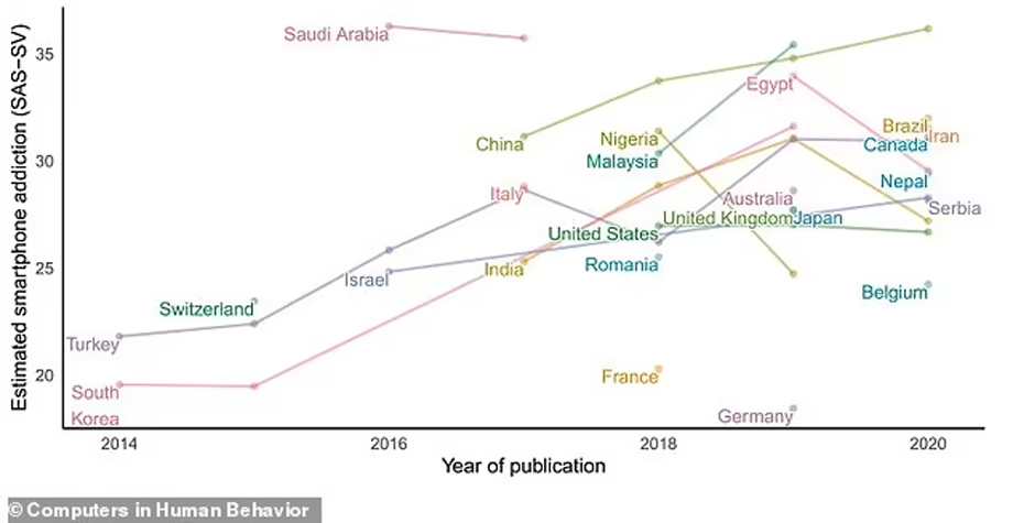 क्यानाडाको म्याकगिल युनिभर्सिटीका अन्वेषकहरूले कम्प्युटर्स इन ह्युमन बिहेवियर नामक जर्नलमा सन् २०१४ देखि २०२० सम्म विश्वका २४ देशका करिब ३४ हजार मानिसमा स्मार्टफोन प्रयोग गर्ने बारे गरेको अध्ययनको निश्कर्ष जारी गरेका छन्।