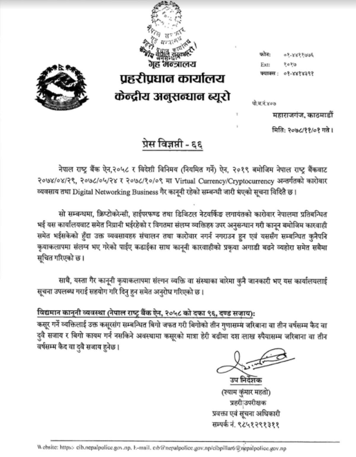 पछिल्लो दिनमा क्रिप्टोकरेन्सी, हाइपरफण्ड तथा डिजिटल नेटवर्किङको कारोबार बढिरहेको सन्दर्भमा नेपालमा गैरकानूनी रहेको क्रिप्टोकरेन्सी, हाइपरफण्ड तथा डिजिटल नेटवर्किङको कारोबार गर्नेको सूचना दिन नेपाल प्रहरीले आग्रह गरेको छ।