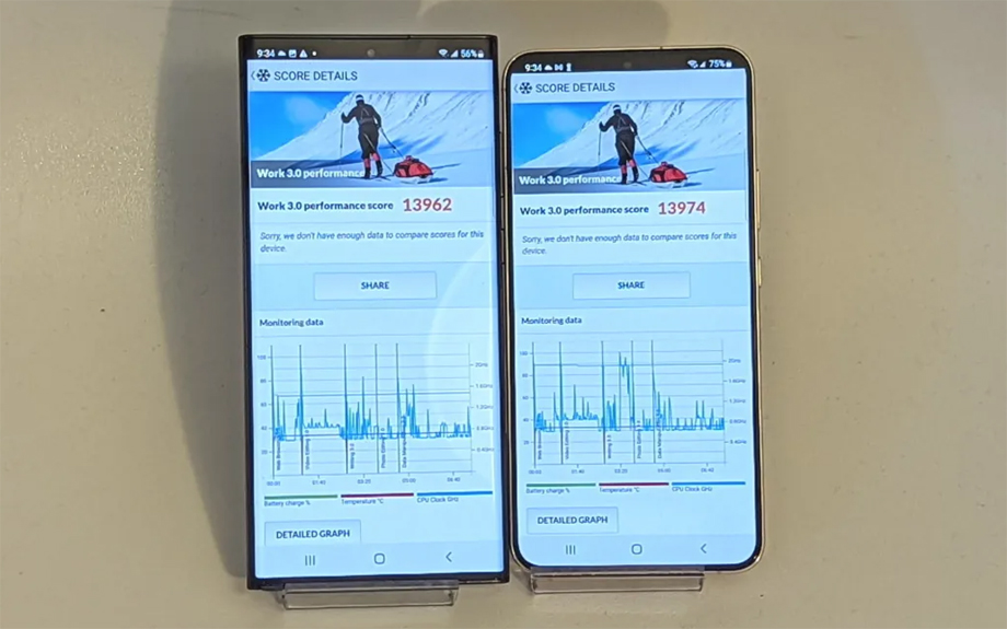 ग्यालेक्सी एस २२ अल्ट्राले मल्टि-कोर स्कोरमा ३,४३३ अंक मात्र हासिल गर्यो, जबकि आईफोन १३ प्रो म्याक्सले ४,६४७ अंक हासिल गर्यो। एकै साथ, ग्यालेक्सी एस २२ अल्ट्राले सिंगल कोरमा १,२३२ अंक मात्र हासिल गर्यो, जबकि आईफोन १३ प्रो म्याक्सले १,७३५ अंक हासिल गर्यो।