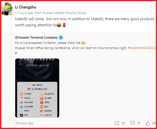 उनले आफ्नो वेबो एकाउन्टमा ‘मेट ५० आउने तर अहिले होइन। मेट ५० बाहेक पनि थुप्रै उत्पादन आकर्षक रहने’ पोस्ट गरेका गिजचाइनाले उल्लेख गरेको छ।