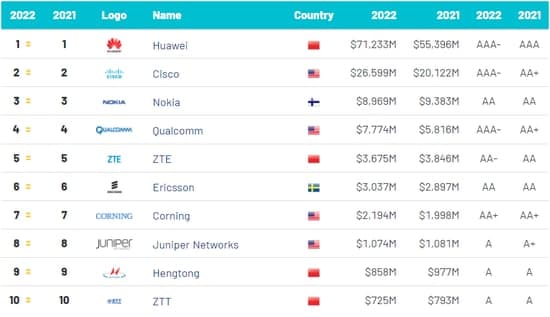 ब्राण्ड फाइनान्सको रिपोर्टमा विश्वका उत्कृष्ट १० दूरसञ्चार उपकरण उत्पादकहरुमा ह्वावे, सिस्को नोकिया, क्वालकम, जेडटीई, एरिक्सशन, कर्निङ, जुनिपर नेटवर्क, हेङटङ अप्टोइलेक्ट्रोनिक्स र झिङ्टियान टेक्नोलोजी परेका छन्।