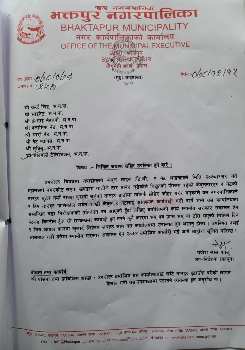 नगरपालिकाका कानून उपनिर्देशक गणेश लाल फोजुले पठाएको पत्रमा विभिन्न सेवा प्रदायकहरुको केबुल लाइन र इन्टरनेट लाइनहरु चैत ९ गते महालक्ष्मी नगरकोट सडक खण्डमा गाडीले तार तानेर चुँडाएको हुँदा विद्युतको पोलमा रहेको केबुल तारहरु र इन्टरनेटको तारहरु चुँडिएकोमा नयाँ राख्दा पुरानो तारहरु सफा नगरेको आरोप लगाएको छ।