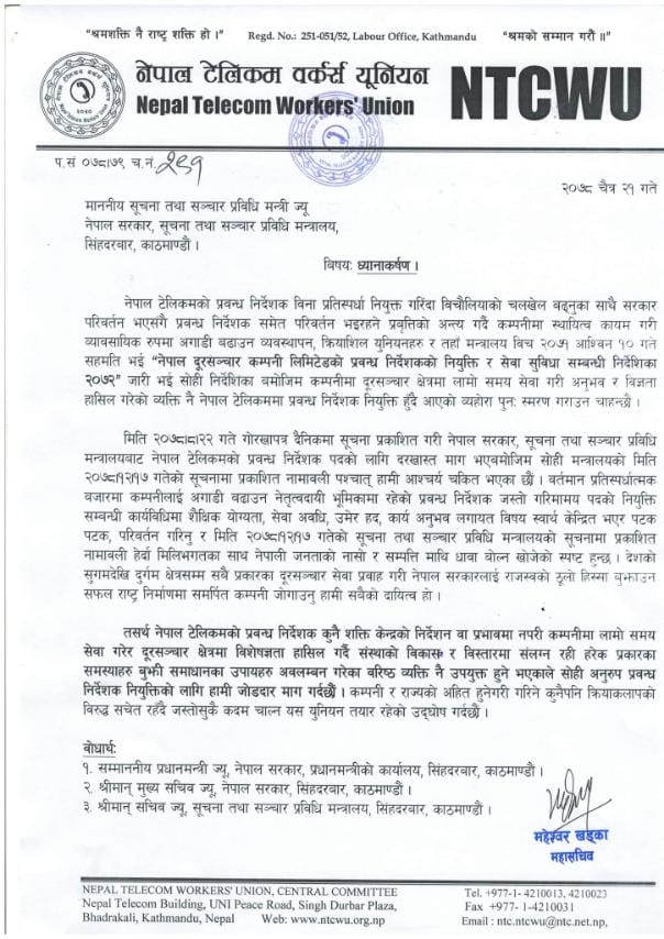 युनियनले चैत २१ गते सूचना तथा सञ्चार प्रविधि मन्त्रीलाई ध्यानाकर्षण पत्र लेख्दै भनेको छ,’कम्पनी र राज्यको अहित हुने गरी गरिने कुनै पनि क्रियाकलापको विरुद्ध सचेत रहँदै जस्तोसुकै कदम चाल्न यस युनियन तयार रहेको उद्घोष गर्दछौं।’