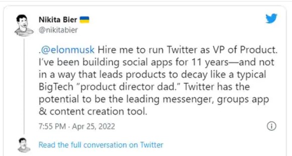 एउटा पोलिङ ऐप टीबीएचकी सह-संस्थापक निकिता बायरले आफूलाई ट्विटर प्रडक्टको उपाध्यक्ष बनाउन आग्रह गर्दै ट्वीट गरेकी छिन्। उनले उक्त पोस्टमा आफूले ११ वर्षदेखि सोशल मिडिया एप्स डेभलप गर्दै आइरहेको उल्लेख गरेकी छिन्।