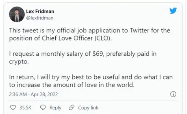 यसै क्रममा अर्का फ्यान फ्रिडम्यानले ट्वीटमा लेखेका छन्, ‘यो ट्वीट आफूलाई ट्विटरको अफिसयल चिफ लभ अफिसरको पदमा जागिर दिइयोस् भन्ने आवेदन हो। मेरो मासिक तलब ६९ डलर हुने र त्यसलाई क्रिप्टोमा भुक्तानी दिनुपर्नेछ। यसको बदलामा म सन्सारमा प्रेमको मात्रा बढाउनका लागि जुनसुकै तरिकाले काम गर्न इच्छुक हुनेछु।’