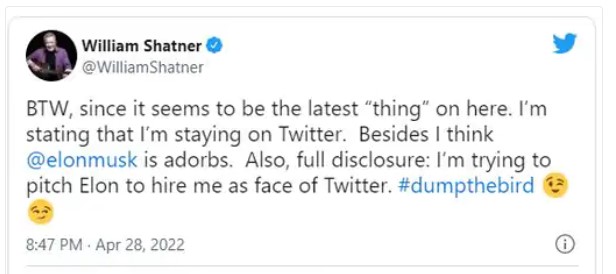 यस्तै स्टार ट्रेक फ्रेन्चाइजीमा यूएसएस इन्टरप्राइकास क्याप्टेन जेम्स टी. कर्कको भूमिकामार्फत् ख्याति कमाएका नायक विलियम शाटनरले पनि आफू अनुभवी भएको ब्यहोराको पोस्ट लेख्दै आफूलाई ट्विटरको ब्राण्डमा काम गर्न दिन आग्रह गरेका छन्।