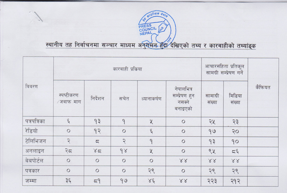 प्रेस काउन्सिल नेपालले १३९ मिडियालाई कारबाही, ४४ वेबपोर्टल नेपालभित्र सम्प्रेषण हुन नसक्ने व्यवस्था र २९ पत्रकारलाई ध्यानाकर्षण गराएको छ।