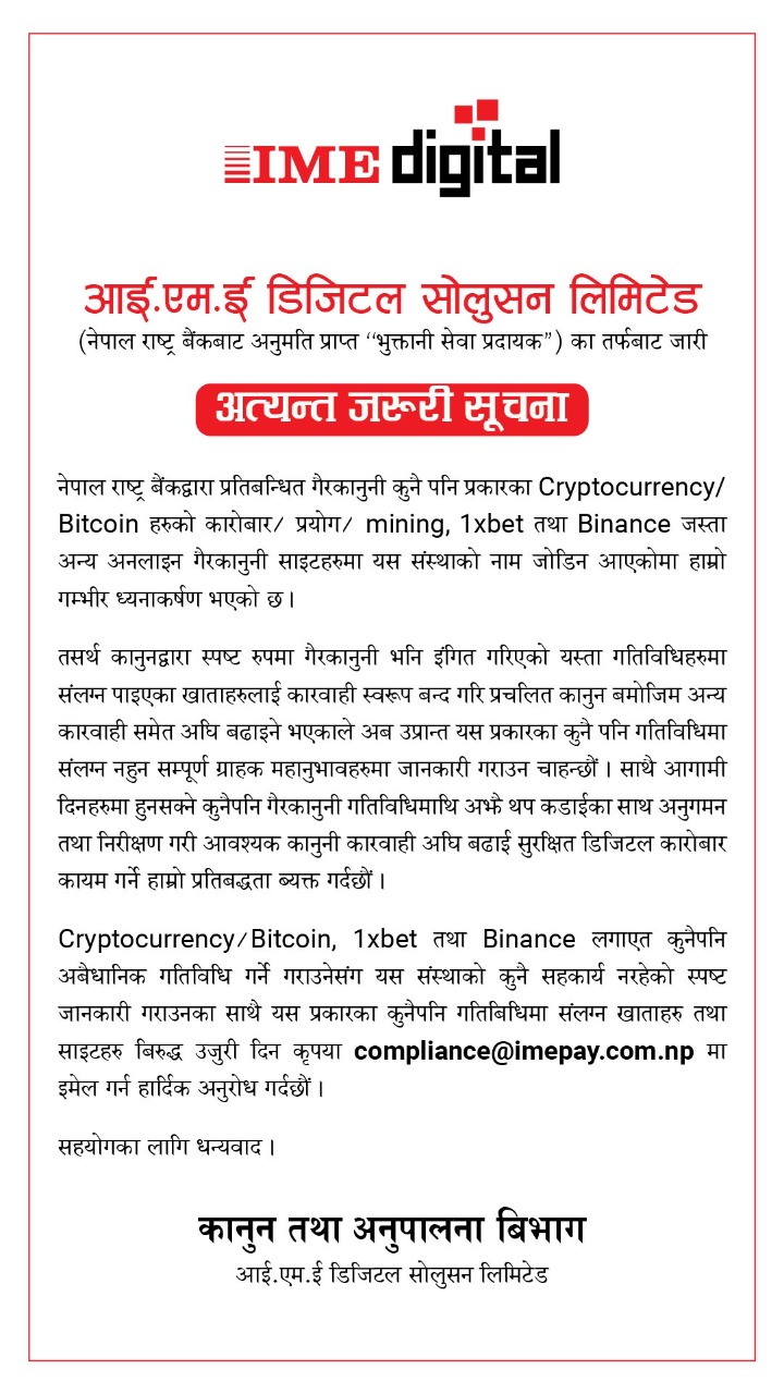 आइएमई पेले ग्राहकहरुलाई क्रिप्टोकरेन्सी/बिटक्वाइनलगायतको प्रयोग, माइनिङ्ग तथा वानएक्सबेट तथा बाइनान्स जस्ता अनलाइन गैरकानूनी साइटहरुमा यस संस्थाको नाम जोडिन आएको भन्दै गंभिर ध्यानाकर्षणभएको उल्लेख गरेको छ।