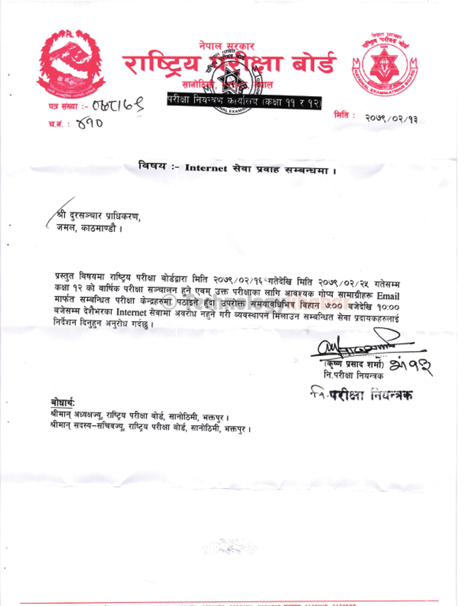 बोर्डले जेठ १३ गते नै नेपाल दूरसञ्चार प्राधिकरणलाई जेठ २५ गतेसम्म कक्षा १२ को वार्षिक परीक्षा संचालन हुने र उक्त परीक्षाका लागि आवश्यक गोप्य सामग्रीहरु इमेलमार्फत देशैभरका परीक्षा केन्द्रहरुमा पठाइने जानकारी गराउँदै सो अवधिमा बिहान ७ बजेदेखि १० बजेको समयसम्म देशभरका इन्टरनेट सेवामा अवरोधन नहुने गरी व्यवस्थापन गर्न सेवा प्रदायकहरुलाई निर्देशन दिनका लागि अनुरोध गरेको थियो ।