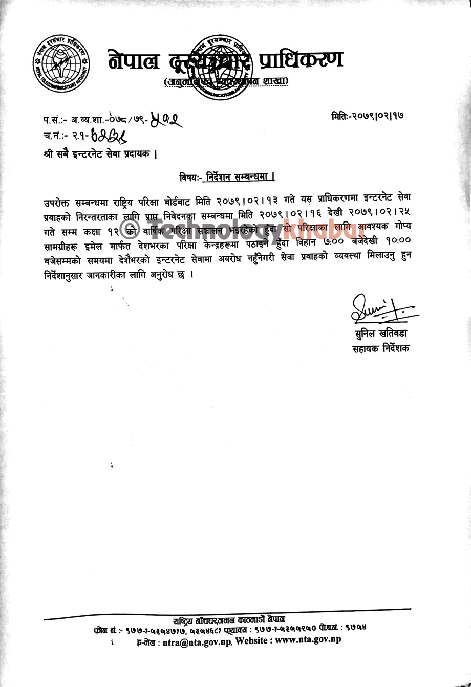 सोहि आधारमा दूरसञ्चार प्राधिकरणले सबै इन्टरनेट सेवा प्रदायकहरुलाई जेठ १७ गते मंगलबार निर्देशन दिँदै जेठ १६ गतेदेखि २५ गतेसम्म कक्षा १२ को वार्षिक परिक्षा संचालन भइरहेको हुँदा सो परिक्षाका लागि आवश्यक गोप्य सामग्रीहरु इमेलमार्फत देशभरका परीक्षा केन्द्रहरुमा पठाइने हुँदा बिहान ७ बजेदेखि १० बजेसम्मको समयमा देशैभरको इन्टरनेट सेवामा अवरोध नहुने गरी सेवा प्रवाहको व्यवस्था मिलाउन निर्देशन दिएको थियो ।