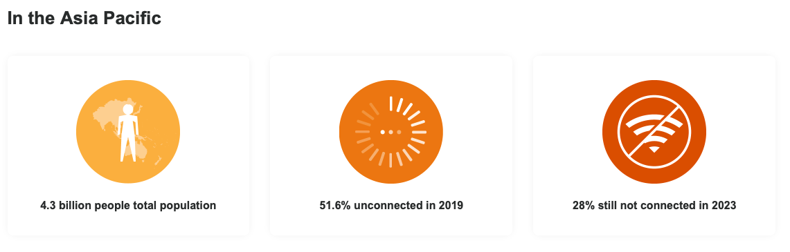 यसका साथसाथै हामीले आधा विश्वमा अझै पनि इन्टरनेटको पहुँच छैन भन्ने जान्न जरुरी छ। एपनिक फाउन्डेसनका अनुसार एसिया-प्यासिफिकमा यस क्षेत्रको कुल इन्टरनेट अडप्सन दर ४८.४% छ जुन कुल जनसंख्याको भन्दा आधा कम छ । २०२३ सम्म क्षेत्रको एक चौथाई भन्दा बढी जनसंख्या अझै डिस्कनेक्टेड नै छोडि, इन्टरनेट अडप्सन ७२% (३.१ बिलियन प्रयोगकर्ताहरू) मा वृद्धि हुने अनुमान गरिएको छ।