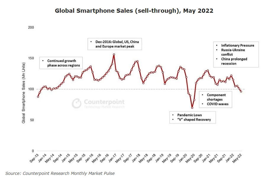 सन् २०२२ मेगमा विश्वव्यापी स्मार्टफोनको ढुवानी ९६ मिलियन मात्र भएको काउन्टरप्वान्टको रिपोर्टमा उल्लेख छ। कोभिड-१९ महामारी शुरु भएको सन् २०२० को पहिलो र दोस्रो क्वाटरपछि चालु वर्षको मेमा एक समय मिलियन भन्दा कम स्मार्टफोन ढुवानी भएको हो।