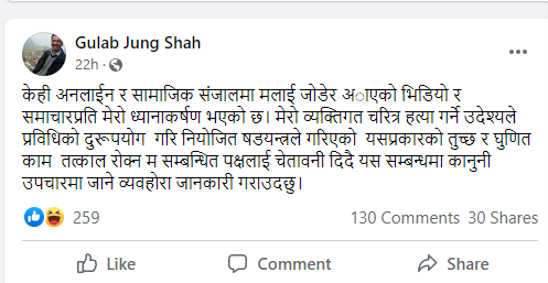 “केही अनलाईन र सामाजिक संजालमा मलाई जाेडेर आएकाे भिडियाे र समाचारप्रति मेराे ध्यानाकर्षण भएकाे छ। मेराे व्यक्तिगत चरित्र हत्या गर्ने उदेश्यले प्रविधिकाे दुरूपयाेग गरि नियाेजित षडयन्त्रले गरिएकाे यस प्रकारकाे तुच्छ र घुणित काम तत्काल राेक्न म सम्बन्धित पक्षलाई चेतावनी दिदै यस सम्बन्धमा कानुनी उपचारमा जाने व्यहाेरा जानकारी गराउँदछु।” उनले आफ्नो फेसबुकमा लेखेका छन्।