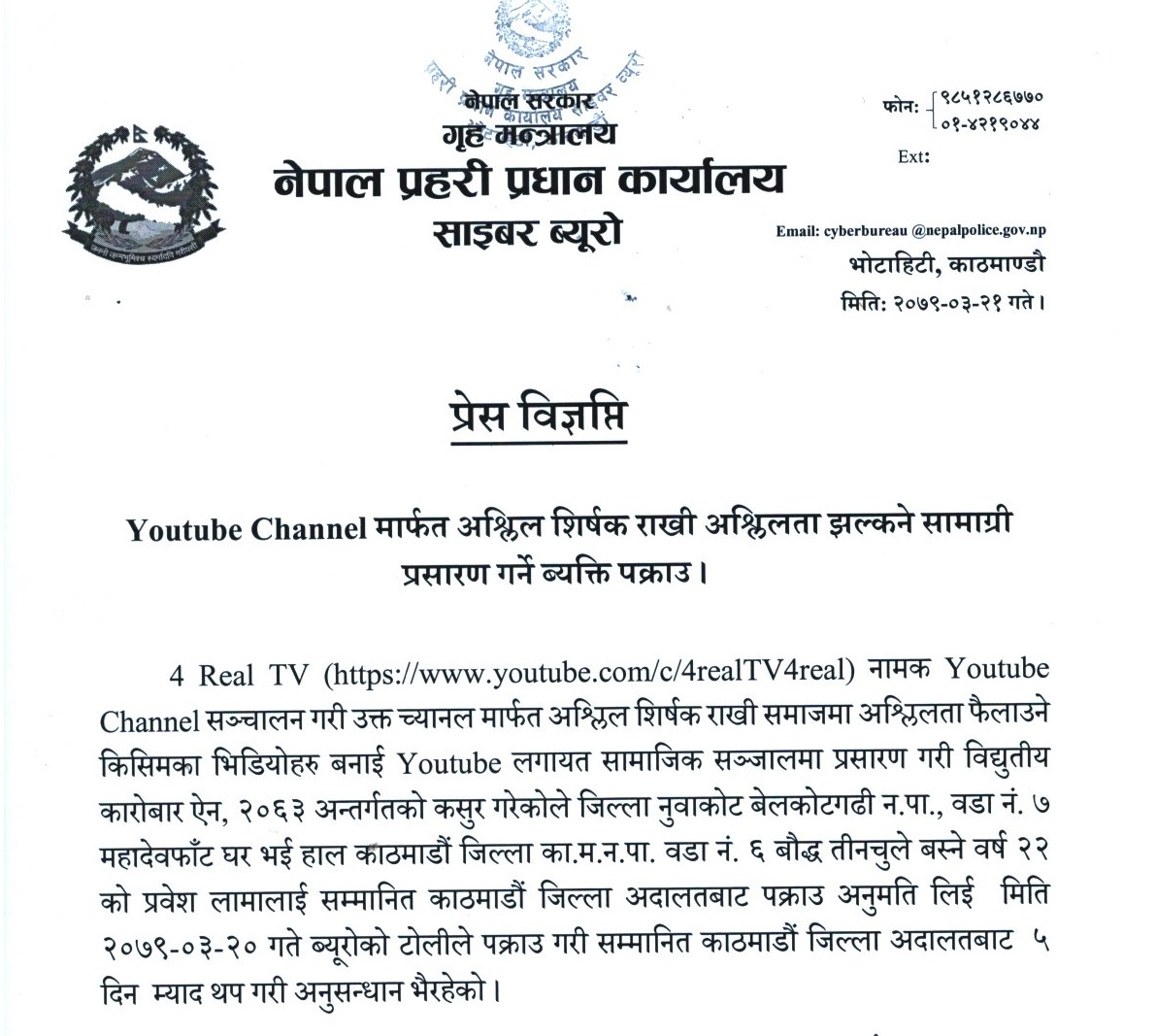 प्रहरीका अनुसार ४ रियल टीभी नामक यूट्युब च्यानल सञ्चालन गरी त्यसमार्फत् अश्लील शीर्षक राखेर समाजमा अश्लीलता फैलाउने किसिमका भिडियो बनाएर यूट्युबलगायत सामाजिक सञ्जालमा राख्ने गरेका थिए।