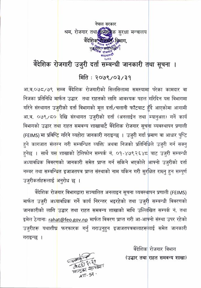 विभागबाट सञ्चालित वैदेशिक रोजगार अनलाइन सूचना व्यवस्थापन प्रणाली (एफईआईएमएस) मार्फत उजुरी अद्यावधिक गर्ने कार्य भइरहेको पनि विभागले सो सूचनामार्फत जानकारी गराएको छ।