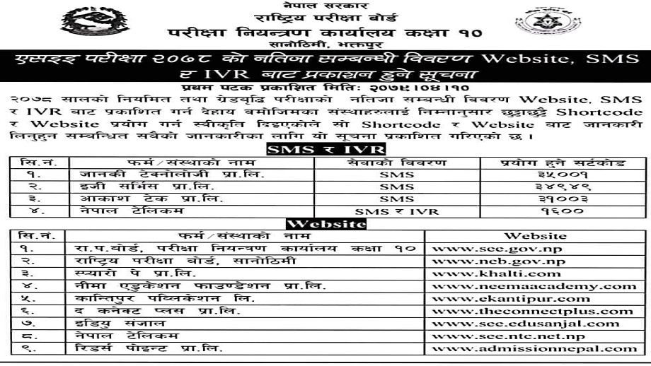 यस्तै निम्न साइटबाट पनि एसईई रिजल्ट हेर्न सकिन्छ