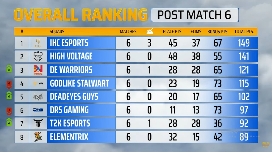 लिग चरणमा हाई भोल्टेजभन्दा १२ अंक बढी बोनस प्राप्त गरेको मंगोलियाको आईएचसी ईस्पोर्टस् शीर्ष स्थानमा रहेको छ। आईएचसीले फाइनल चरणमा उत्कृष्ट शुरुवात गरेको थियो। पहिलो ३ खेलमै चिकेन डिनर हासिल गर्दै ७५ अंक प्राप्त गरेको थियो। तर अन्तिम तीन खेल खराब हुँदा आईएचसीले अंक तालिकामा ठूलो अग्रता हासिल गर्न सकेन। आईएचसीले पहिलो दिन ४५ प्लेसमेन्ट प्वाइन्ट, ३७ इलिमिनेसन प्वाइन्ट र ६७ बोनस प्वाइन्टसहित १४९ अंक प्राप्त गरेको छ।