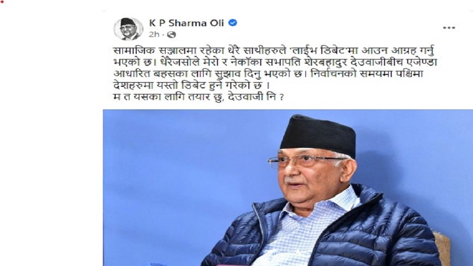 उनले फेसबुकमा पोष्ट गरेका छन्,“सामाजिक सञ्जालमा रहेका धेरै साथीहरुले “लाईभ डिबेट”मा आउन आग्रह गर्नुभएको छ। धेरैजसोले मेरो र नेकाका सभापति शेरबहादुर देउवाजीबीच एजेण्डा आधारित बहसका लागि सुझाव दिनु भएको छ। निर्वाचनको समयमा पश्चिमा देशहरुमा यस्तो डिबेट हुने गरेको छ। म त यसका लागि तयार छु, देउवाजी नि?”