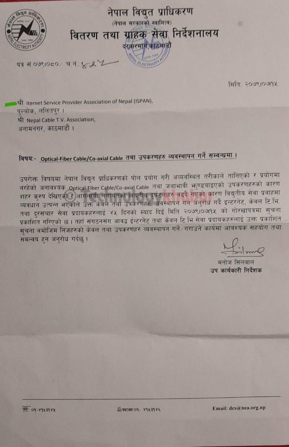 नेपाल विद्युत प्राधिकरण (एनईए) ले इन्टरनेट सेवा प्रदायक संघ नेपाल (आइस्पान) र नेपाल केबल टिभी एसोसिएसनलाई सिधै पत्र पठाएर पोलहरुमा रहेका र अव्यवस्थित तरिकाले तानिएको तार मिलाउन भनेको छ।