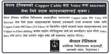 नेपाल टेलिकम प्रादेशिक निर्देशनालय काठमाडौंबाट परम्परागत कपर केबलबाट भ्वाइस तथा इन्टरनेट सेवा लिने ग्राहक महानुभावहरूलाई नयाँ प्रविधिमा जान भनिएको हो।