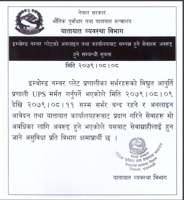 इम्बोस्ड नम्बर प्लेट प्रणालीका सर्भरहरुको विद्युत आपुर्ति प्रणाली यूएसपी मर्मत गर्नु पर्ने भएकाले ३ दिनका लागि सेवा बन्द हुने यातायात व्यवस्था विभागले जानकारी दिएको छ।
