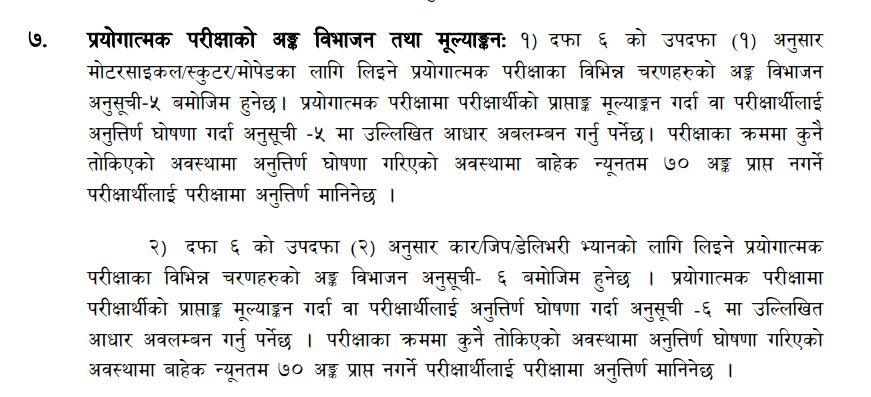 बागमती प्रदेशमा सवारी चालक अनुमति पत्र (ड्राइभिङ लाइसेन्स) को प्रयोगात्मक परीक्षामा ७० अंक प्राप्त गरे पास हुने व्यवस्था कार्यान्वयनमा आएको छ।